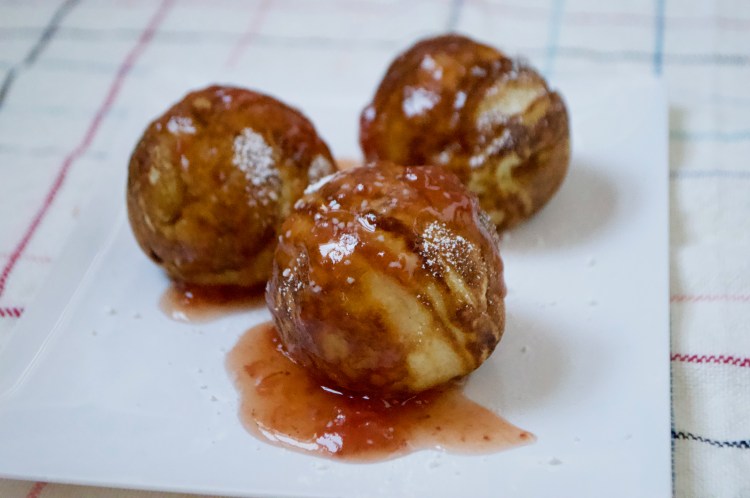 Traditional: æbleskiver topped with strawberry jam and powdered sugar